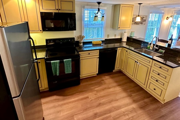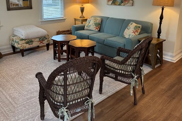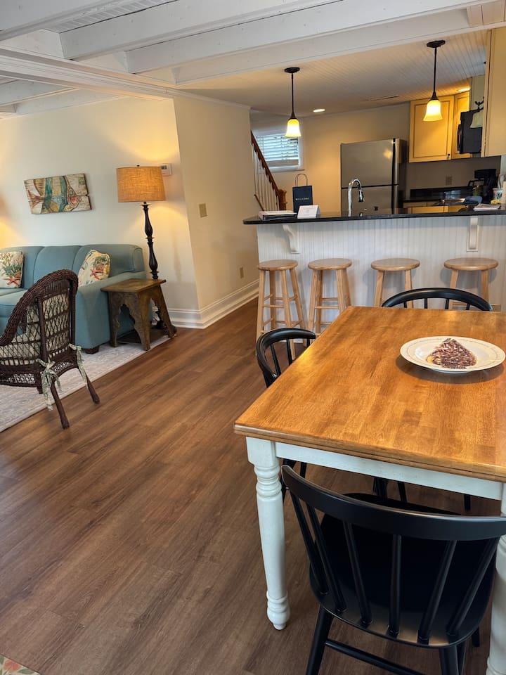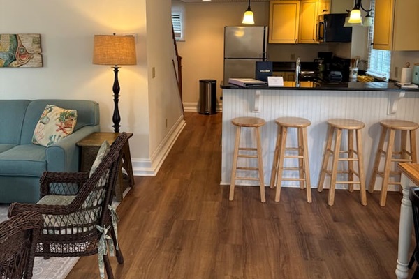 • Inviting Downstairs Living: Features a spacious, open-plan living area, including a comfortable living room with a pullout bed couch, a dining area, and an updated full kitchen—ideal if you prefer to dine in.